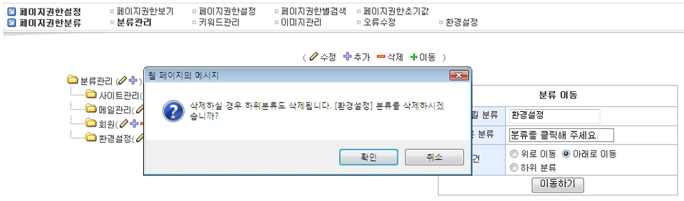 | (2) 분류관리는 분류를 생성, 수정, 이동, 삭제하는 기능을 가지며 환경설정을 통하여 다양한 옵션에 대해 관리자가 설정을 할 수 있습니다. |