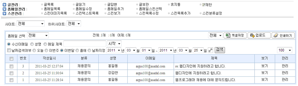| (1) 사용자가 웹페이지에서 작성한 폼메일의 내용은 관리자페이지의 글목록에 쌓입니다. |