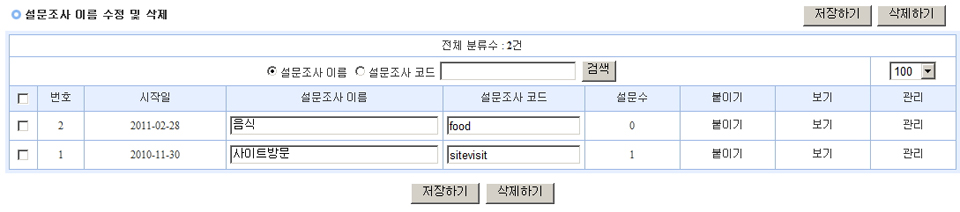 | (2) 설문분류추가에서 설문조사 이름과 코드를 생성하면 설문분류목록에 나타납니다. |