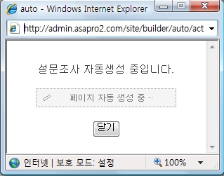 | (6) 사이트 선택, 메뉴 선택, 보임/숨김 선택, 위치 선택을 하고 확인 버튼을 클릭하면 아래와 같이 설문조사 자동생성 중을 알려주는 새창이 뜹니다. |