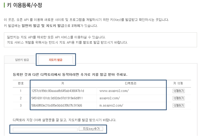 | - 지도키값 예 : 1257cb99dc80aaaafb645ab438047b1d) |