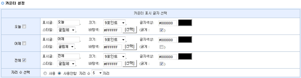 | (2) 표시글에서 오늘, 어제, 전체의 문구를 바꿀 수 있습니다. 어제, 오늘, 전체의 글자 크기, 스타일도 선택할 수 있습니다. |