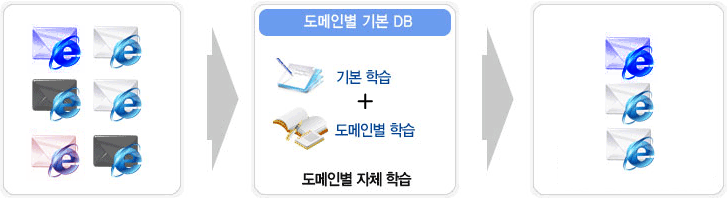 일정 수준 학습시킨 필터 DB를 사용하면서 도메인별로 관리할 수 있습니다. 이때 해당 도메인 성향에 따라서 관리가 가능하며 도메인만의 특별한 필터 DB를 구현할 수 있습니다. 도메인별 기본 DB를 사용하면 기본 학습된 정보와 도메인별로 사용자가 직접 학습시킨 정보로 사용자가 원하는 정확한 스팸필터링할 수 있습니다.