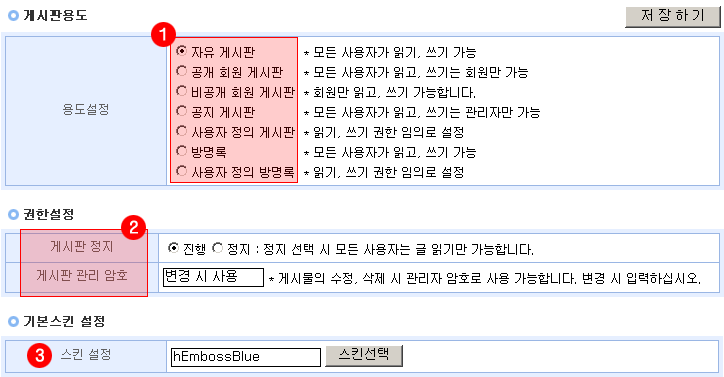 2. 권한설정 : 게시판 사용여부를 정할 수 있으며 정지 선택 시 모든 사용자는 글 읽기만 가능합니다. 게시판 관리 암호는 게시물의 수정, 삭제 시 암호로 사용 가능합니다.